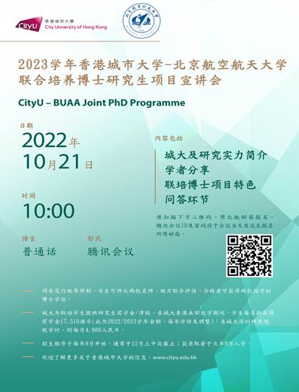 2023年北航-香港城市大学联合培养博士生项目宣讲会定于10月21日上午10点召开,电子海报见下图。请有意向同学通过扫描二维码或点击链接至网页进行报名。